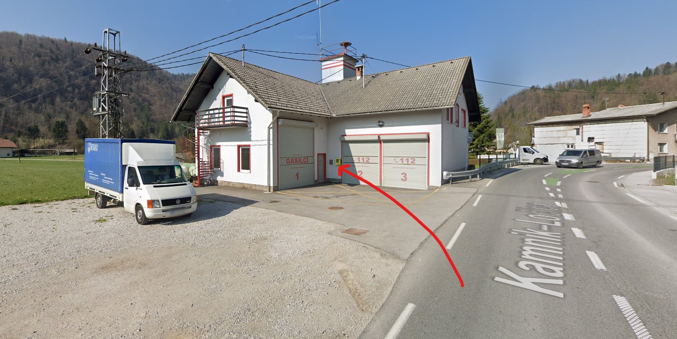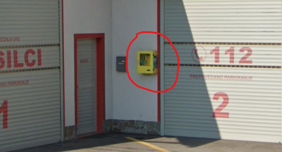 [OPIS POTI] AED se nahaja pri vhodu v gasilski dom [KOORDINATE] 46.40907416304003, 13.843407198276578