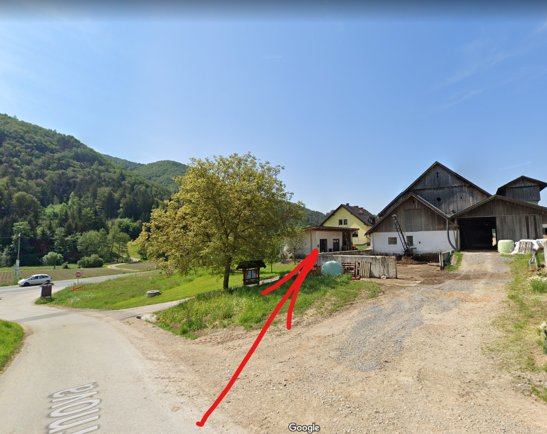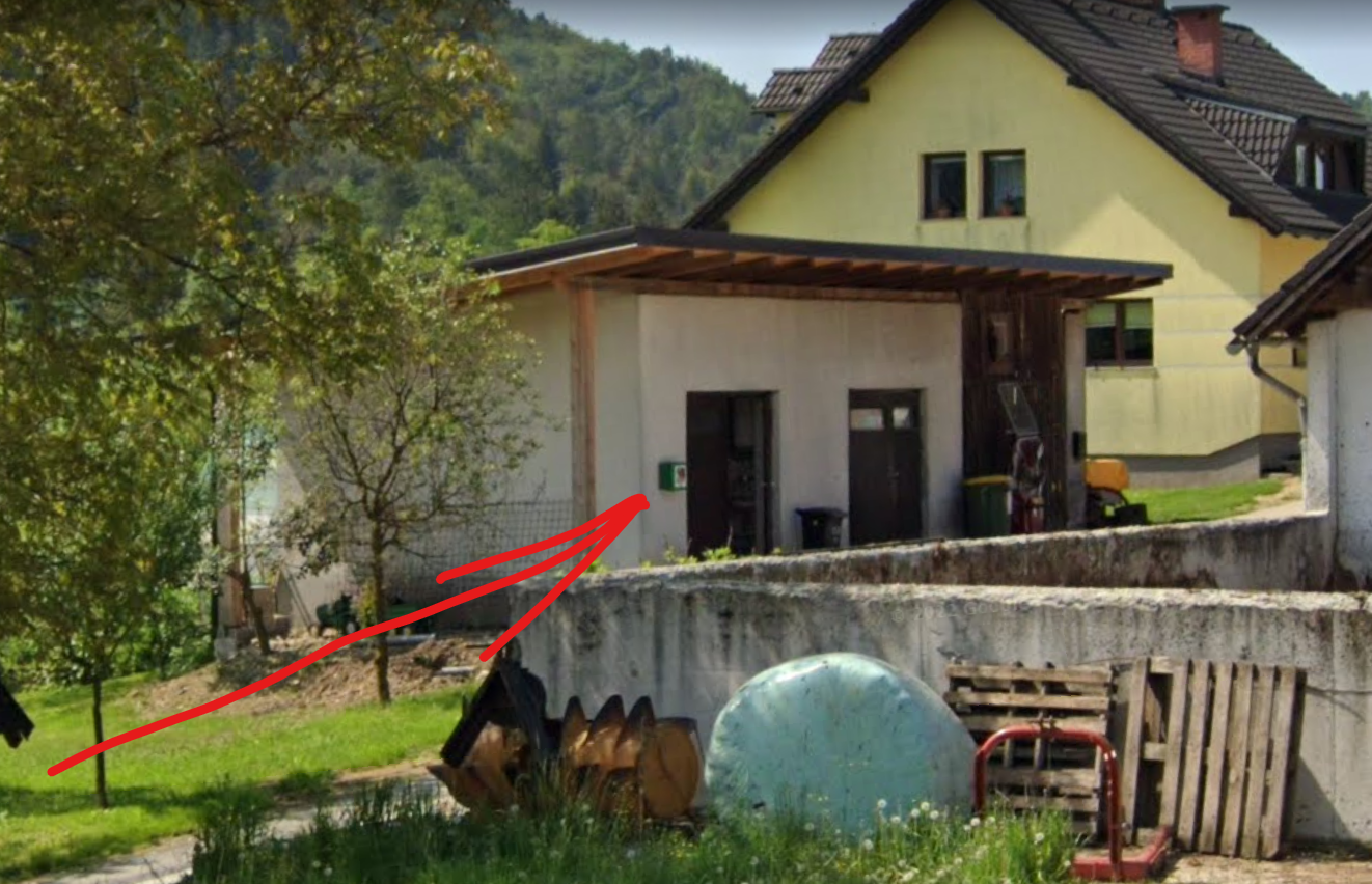 [OPIS POTI] zunaj, na manjšem objektu mlekarne ob stanovanjski hiši